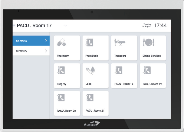 The device can have a number of separate screens / tabs for varied use, and one of those optional screens is the Workflow Screen. The workflow screen can have multiple tabs for different types of application use. Typically some tabs would be used for notifying staff of a requirement (nurse needed, food or drink required, or an issue in the room), but the programmable buttons can be used for a variety of use cases.